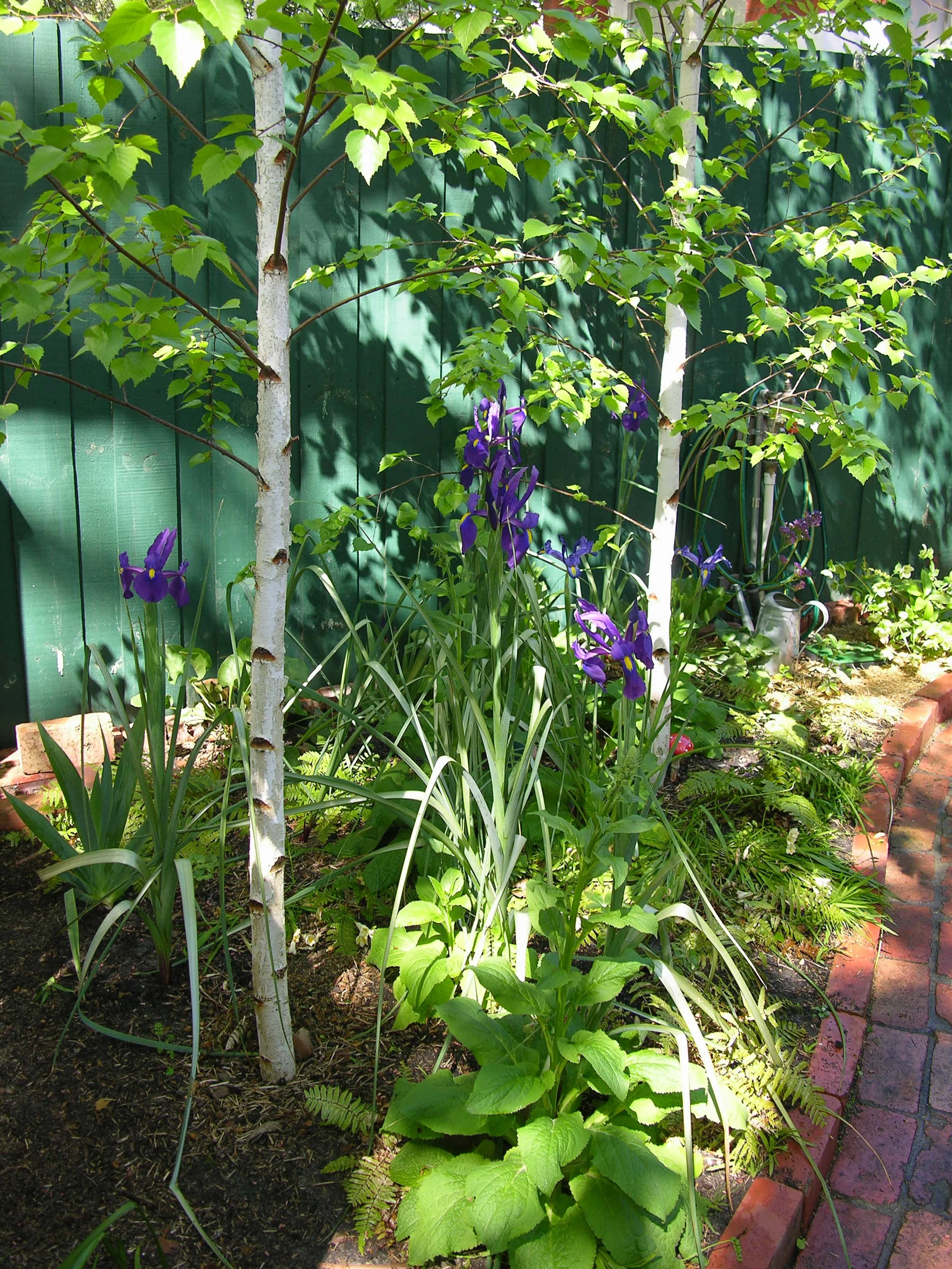 The design for this Victorian terrace was a mini woodland. Silver Birch trees underplanted with meadow flowers, Foxgloves, Ferns and easy-care grass area.